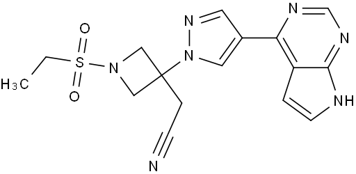 Baricitinib, also known as INCB-028050; INCB-28050; LY-3009104, is an oral highly selective JAK1 and JAK2 inhibitor for inflammatory and autoimmune diseases. There are four known JAK enzymes: JAK1, JAK2, JAK3 and TYK2. JAK-dependent cytokines have been implicated in the pathogenesis of a number of inflammatory and autoimmune diseases, suggesting that JAK inhibitors may be useful for the treatment of a broad range of inflammatory conditions. Baricitinib demonstrates approximately 100-fold greater potency of inhibition against JAK1 and JAK2 than JAK3 in kinase assays.